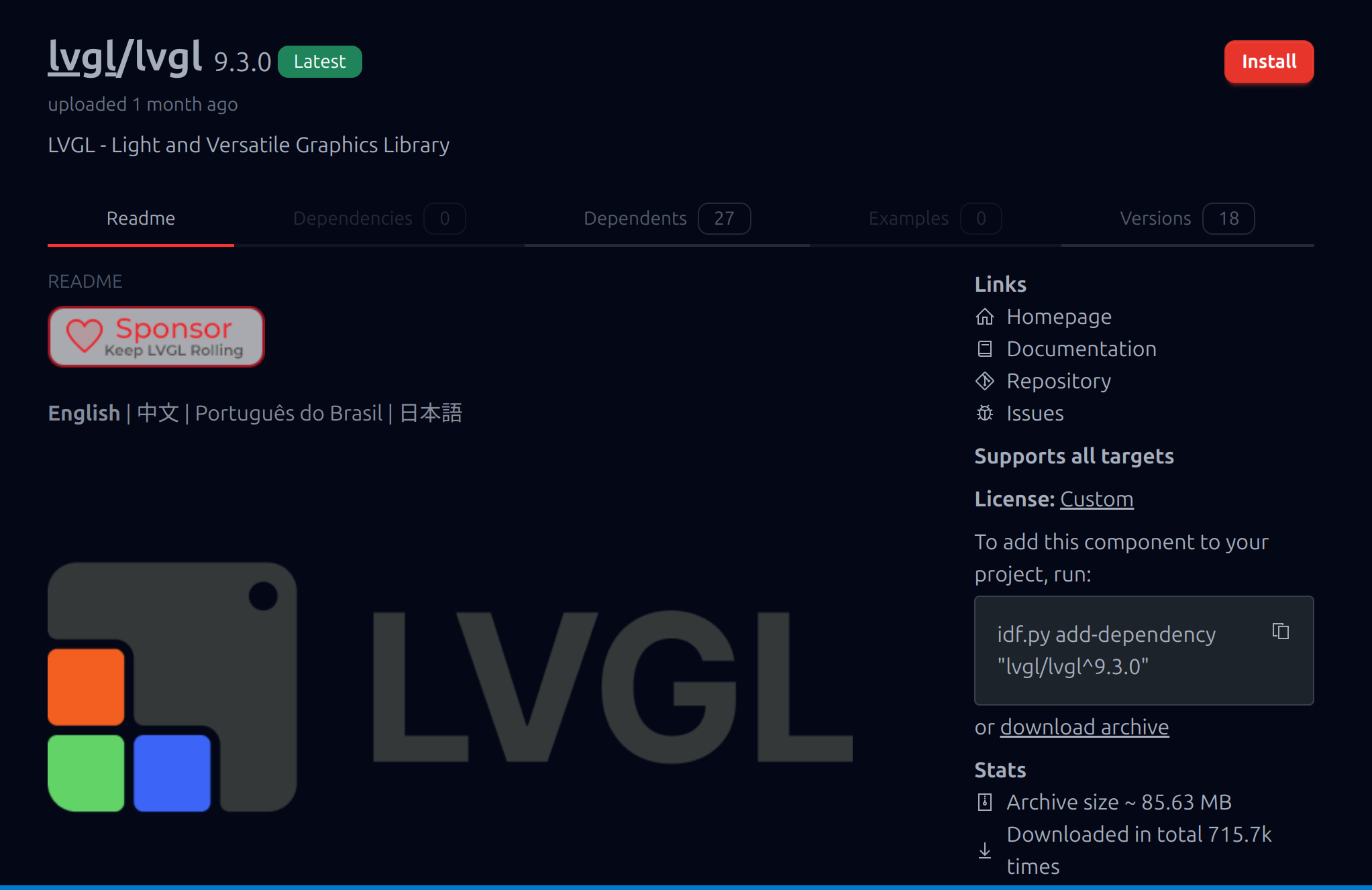 The next step is to add the LVGL component from Espressif’s component registry page: